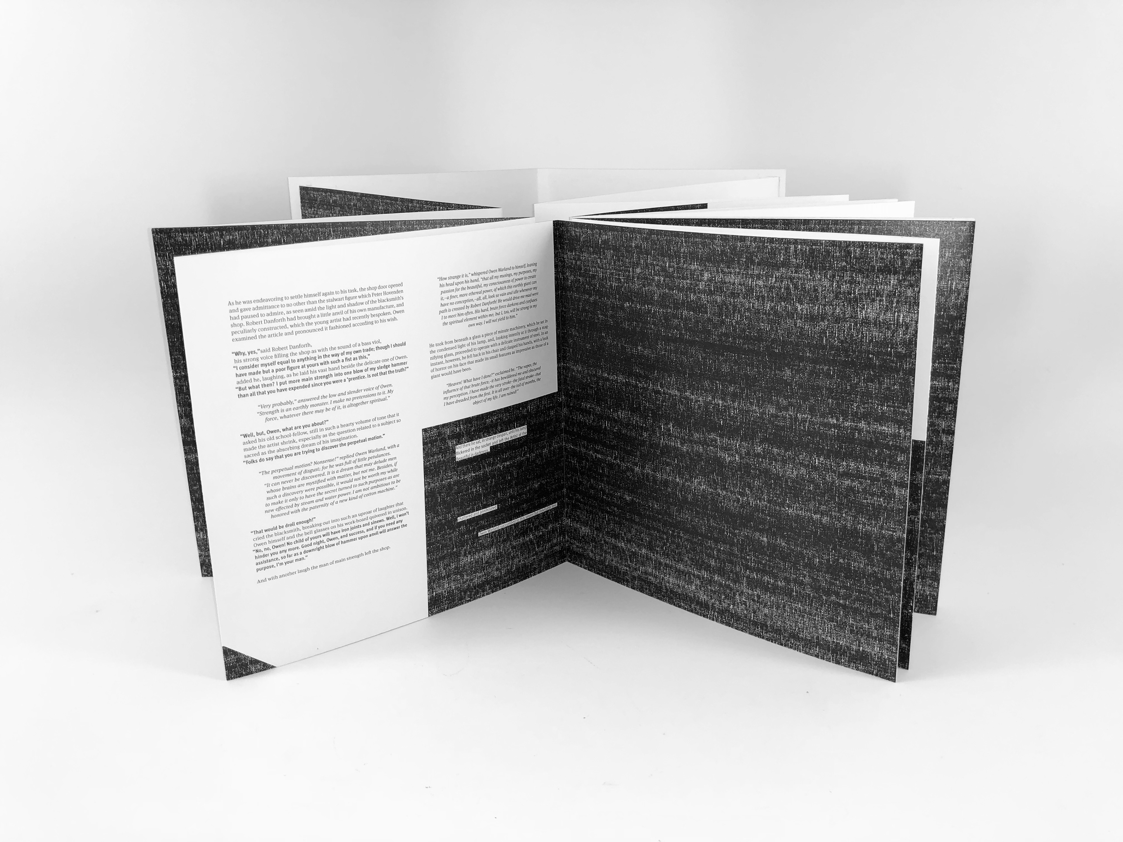 This is a highly conceptual approach to Nathaniel Hawthorne's "The Artist of the Beautiful." Instead of binding the book, it is instead left freely hanging with only the first and last page attached to the cover. By doing this, when opened the book creates a circle that represents the cyclical loop of time. The textures of overlapping type correspond with the protagonist's fits of mental instability and function as visual representations of anxiety and depression meant to make the reader uncomfortable as they approach them.
